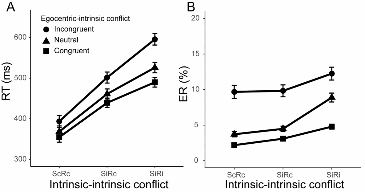 研究结果表明,物体-物体参照系冲突在刺激表征阶段和反应选择阶段均会发生,而自我-物体参照系冲突仅发生在反应选择阶段。这两种冲突在反应选择阶段共享一种共同的冲突解决机制。