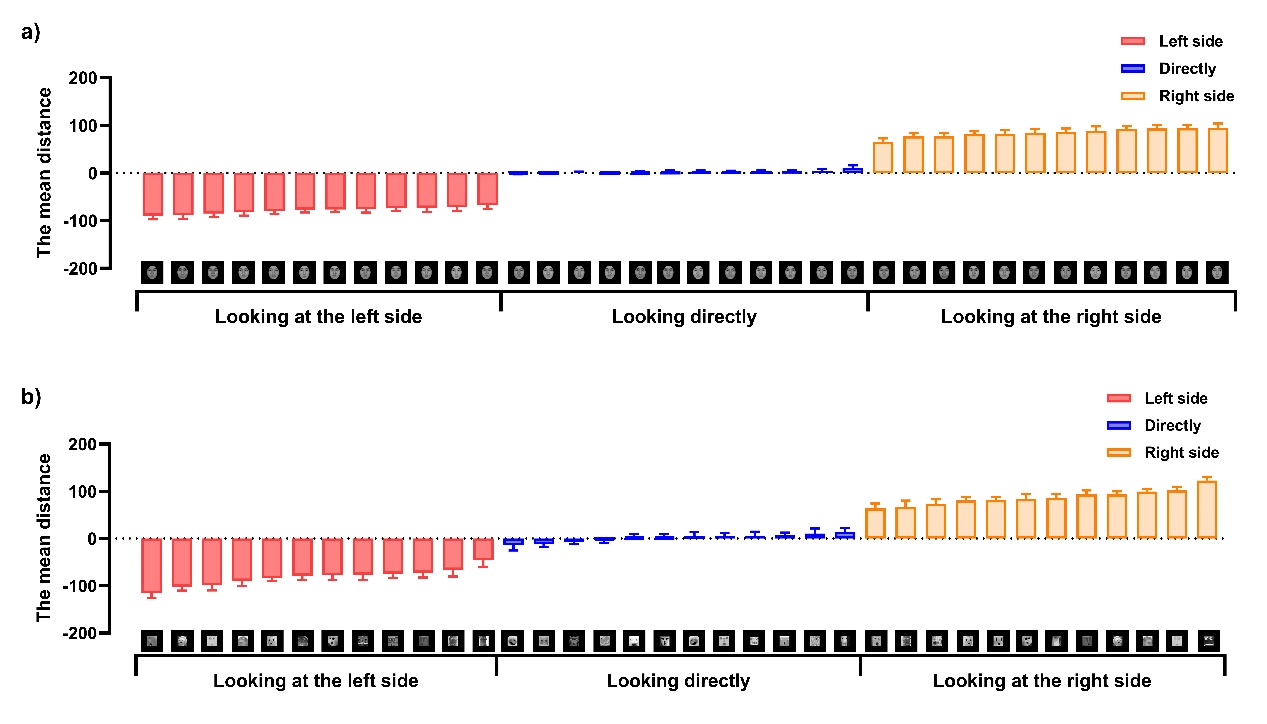 图1. 采集了目光转移面孔(a)和类面孔物体(b)视觉感知方向的距离,以作为后续实验的线索刺激