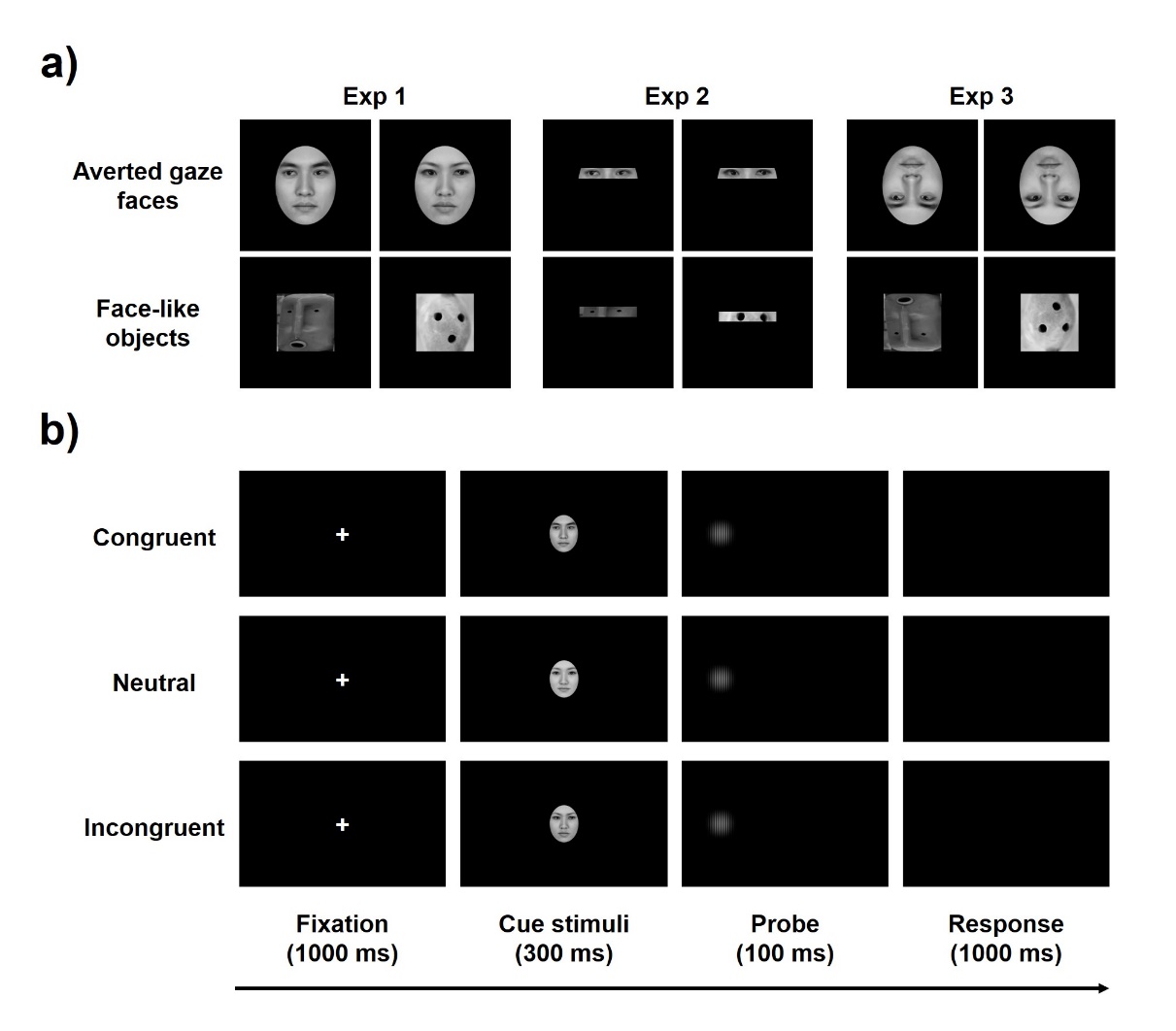 (a)在三个实验中所用的线索刺激,包括目光转移面孔和类面孔物体;(b)当使用目光转移面孔为线索刺激时,单次试验的流程图