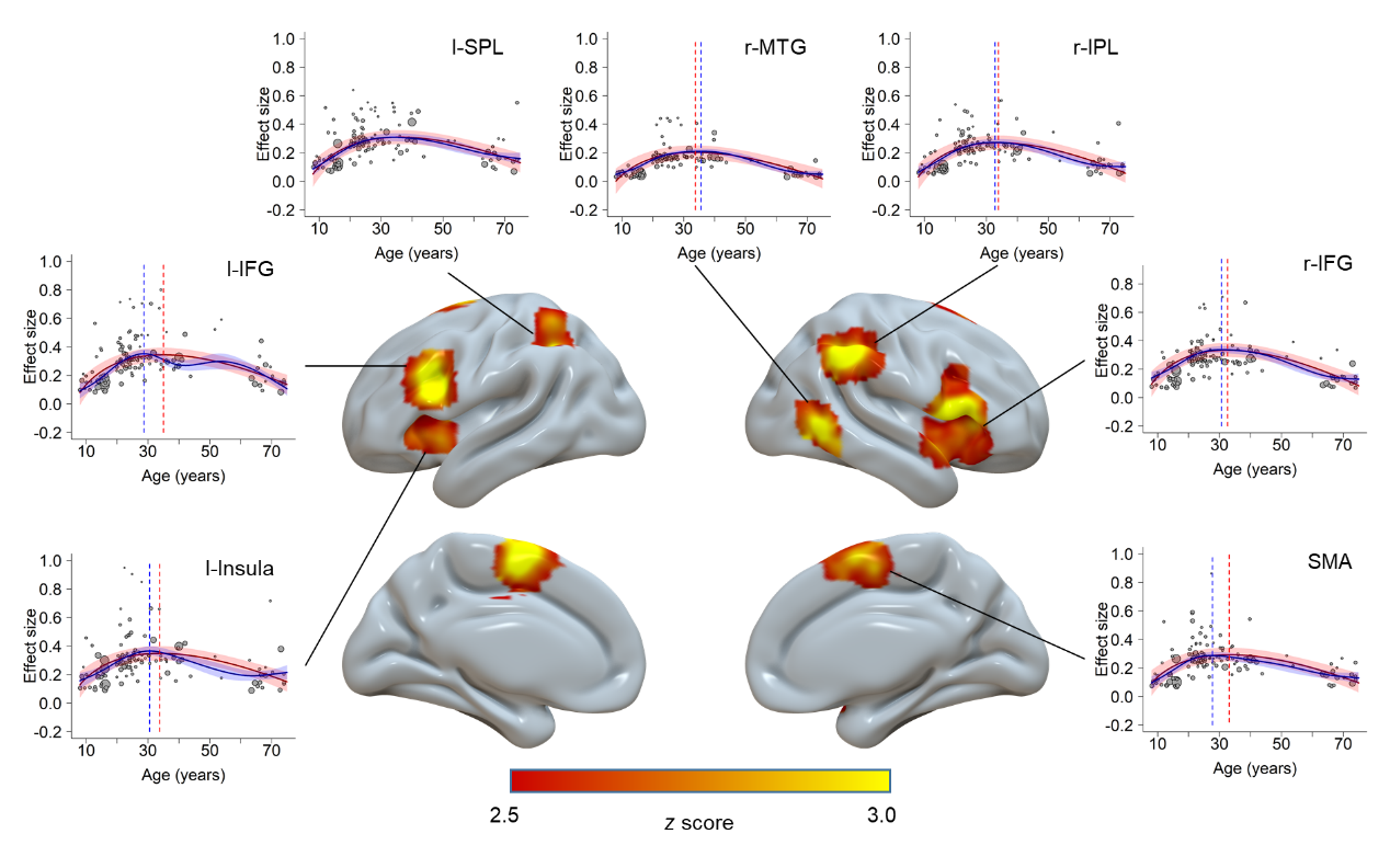 为揭示认知控制大脑活动的生命周期变化规律,加深对人脑发育与衰老机制的理解,永乐汇刘勋研究组开展了一项合作研究。该研究收集到139项采用认知冲突任务(比如判断←←→←←中间的箭头朝向,忽略两侧的箭头)相关的神经影像研究(涵盖了3765名5-85岁的参与者),并通过基于种子点的效应量映射方法(seed-based d mapping, SDM)、广义可加模型 (generalized additive model, GAM)及模型比较等方法,进行了系统性荟萃分析。