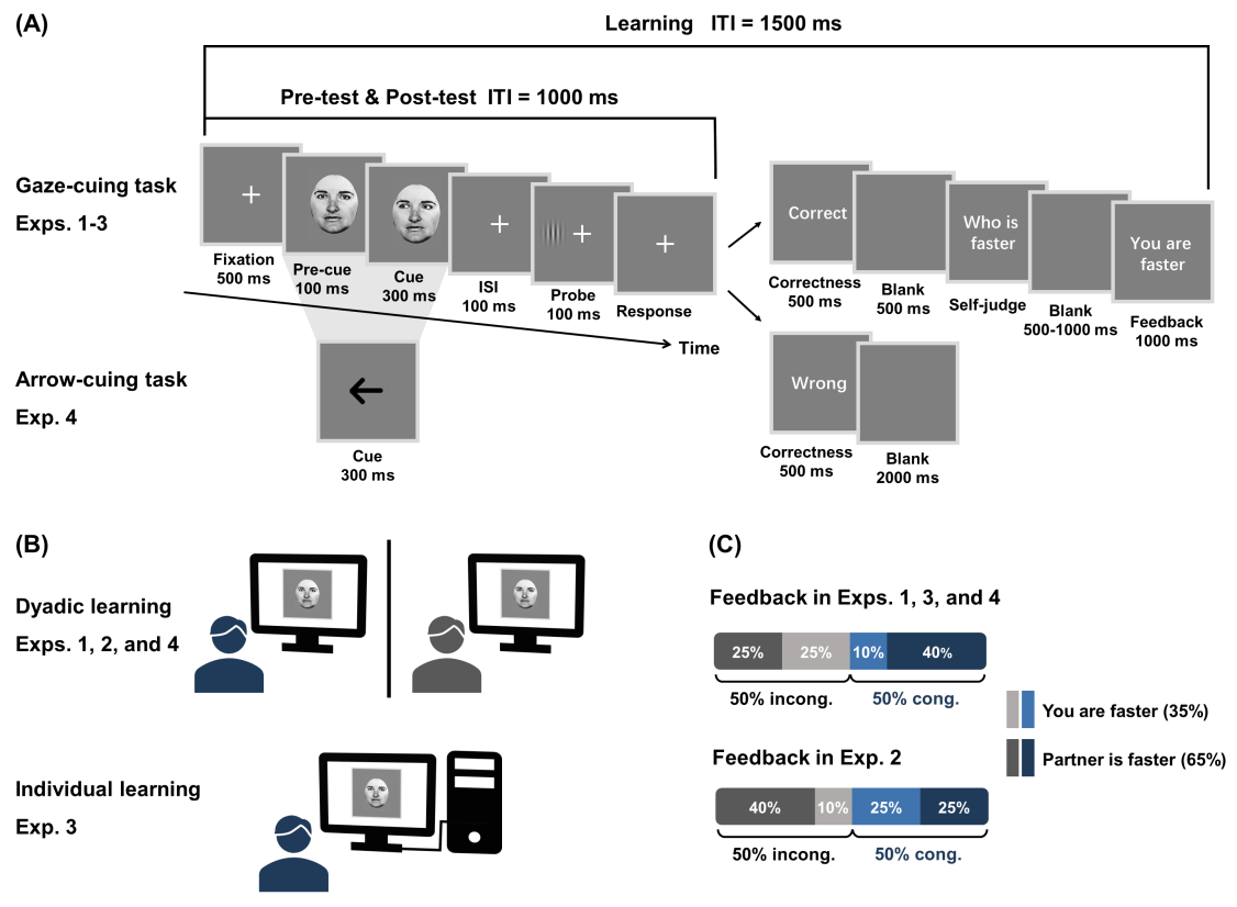 永乐汇蒋毅研究组的科研人员开展了一项研究(图1),发现与在社会线索利用方面更加熟练的同伴进行双人学习能提高被试的社会性注意能力。研究采用双人学习范式来构建社会情境,两名被试同时完成注视线索提示任务,并通过即时反馈得知谁在本轮按键中做出了更快的反应。这看似真实的互动背后隐藏着精心设计的“剧本”:被试并不知道他们收到的反馈是预先设定好的(图1C)。