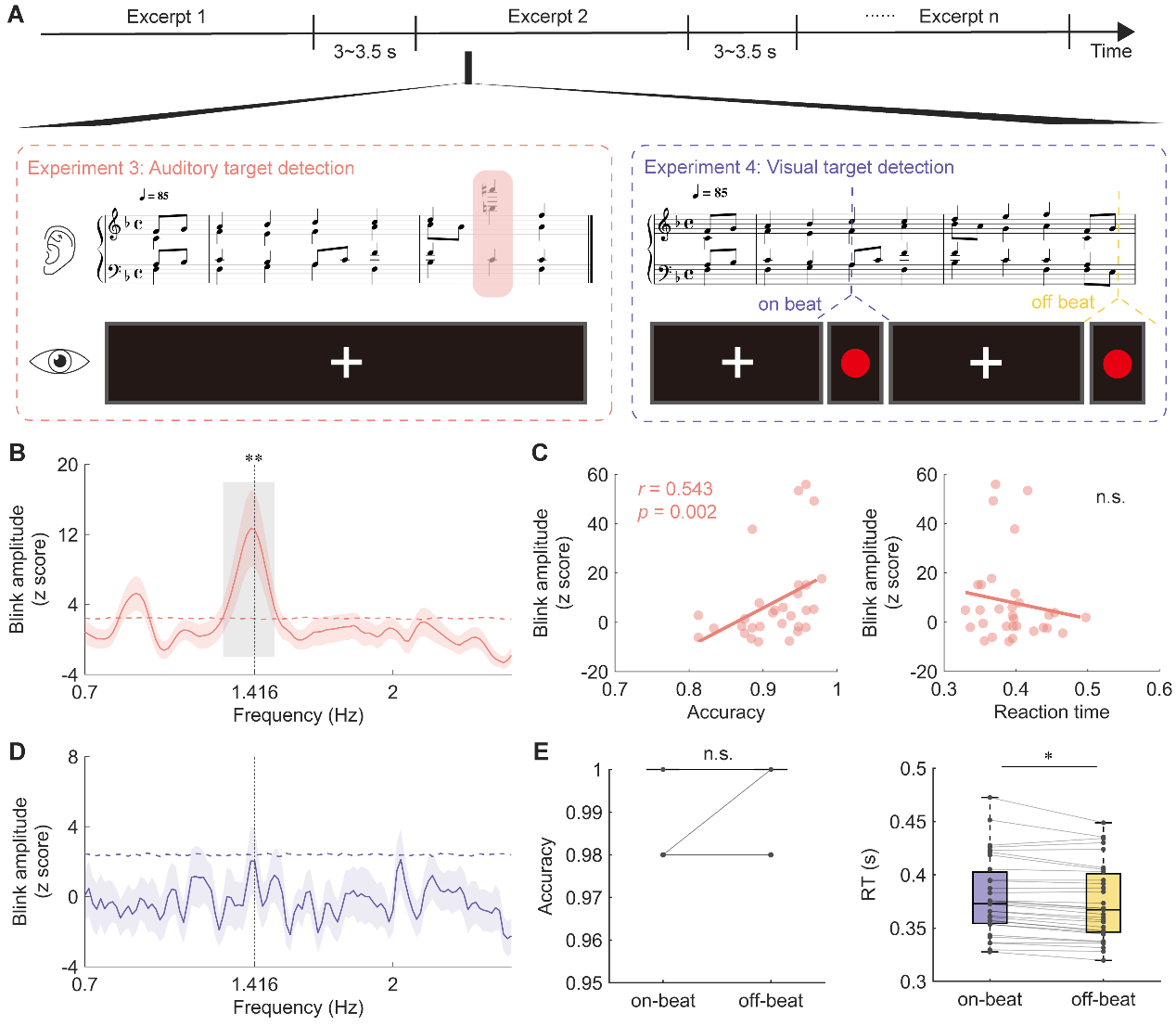 研究结果发现,即使没有刻意控制或有意识的觉知,受试者的眨眼频率仍会精准对齐音乐节拍(图2A)。同样,脑电波也呈现出同步振荡,仿佛大脑内部有个“节拍器”在指挥(图2D)。