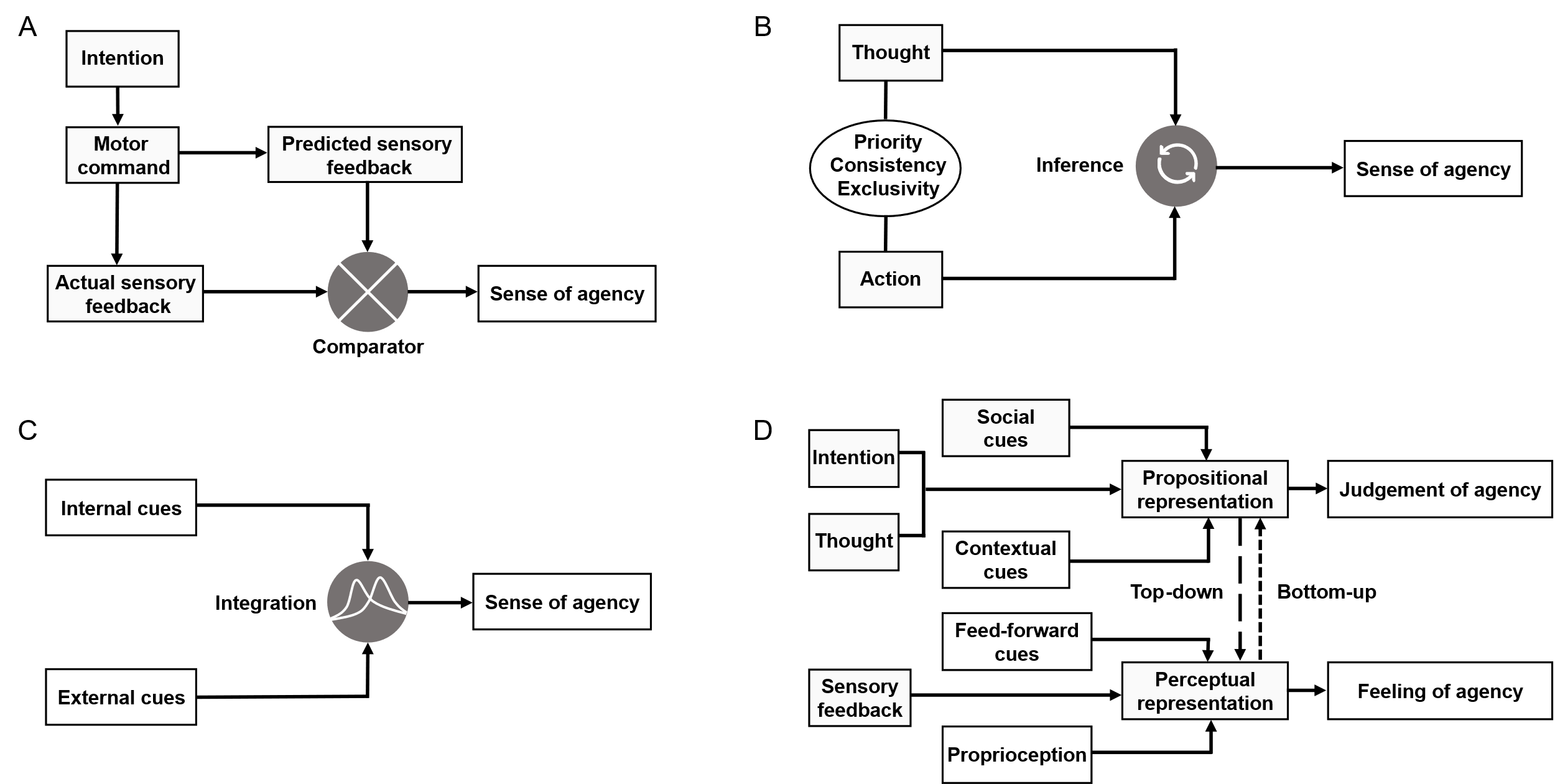 A)动作比较器模型;B)表观心理因果理论;C)线索整合模型; D)两阶段模型