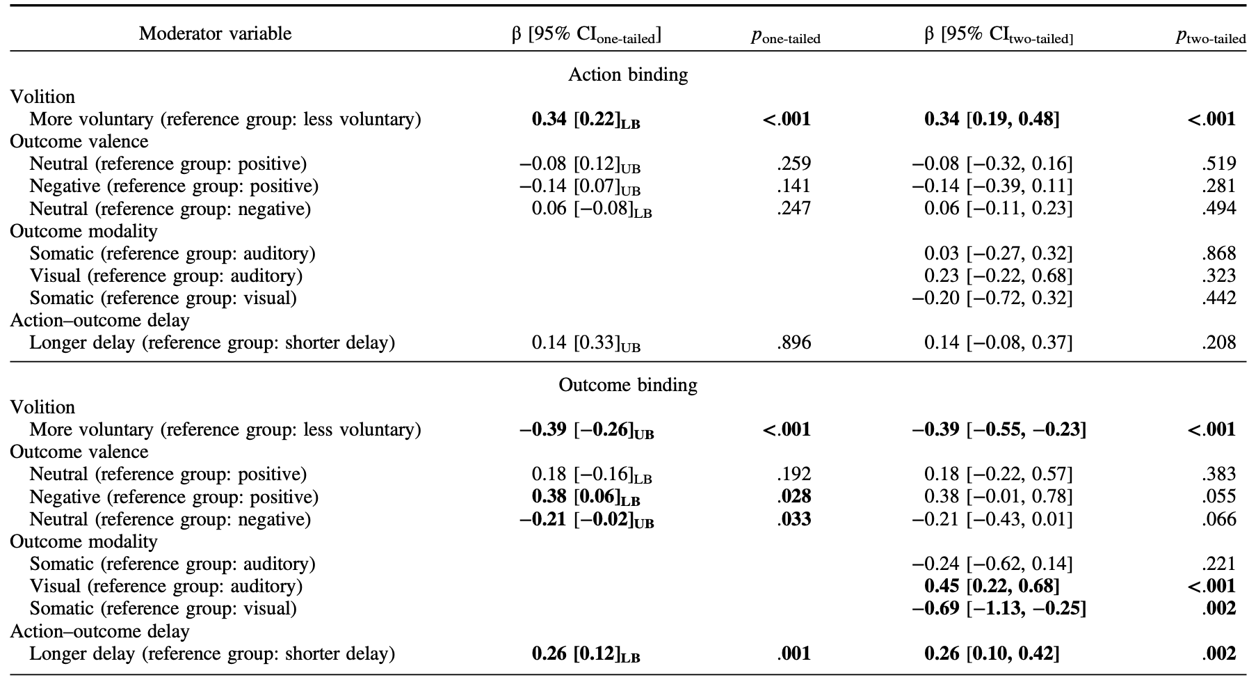 行为学元分析发现,结果绑定(效应量 = -0.85)的强度远大于动作绑定(效应量 = 0.42)。通过调节因子分析发现:意志是核心调节因素,强意志条件(如主动运动)均比弱意志条件(如被动运动)产生更大的动作绑定和结果绑定;结果模态的影响表现为听觉和触觉结果比视觉结果引发更大的结果绑定;动作-结果延迟影响表现为延迟时间越长,结果绑定效应越弱;结果效价的影响表现为积极结果相比消极结果会减弱结果绑定(见表1和图3)。