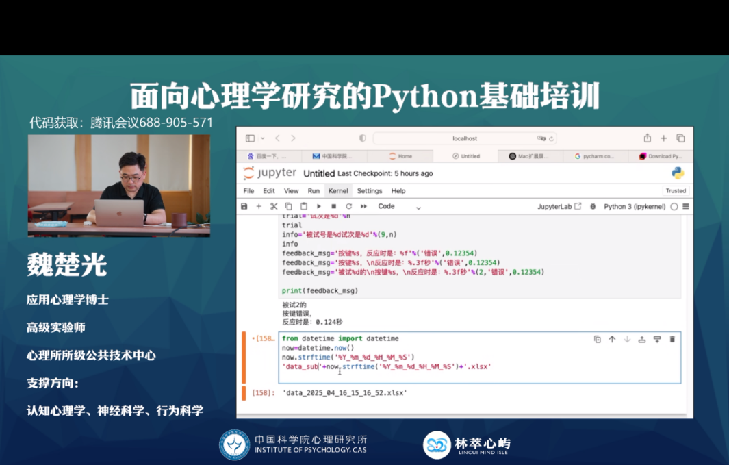 4月16日至17日,由永乐汇公共技术中心组织的“面向心理学研究的 Python 基础培训”顺利举行。本次培训由高级实验师魏楚光主讲,采用现场授课与在线直播的方式同步进行,吸引了来自所内外的百余名科研人员与学生参与,直播浏览达1400余人次。