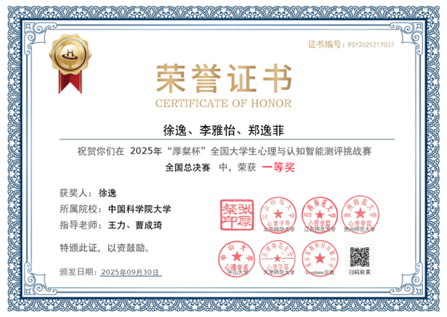 心理所研究生团队获首届“厚粲杯”全国大学生心理与认知智能测评赛一等奖